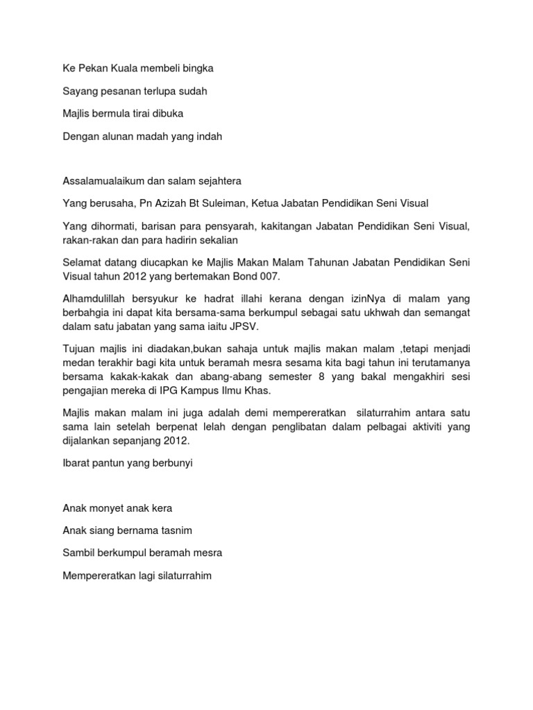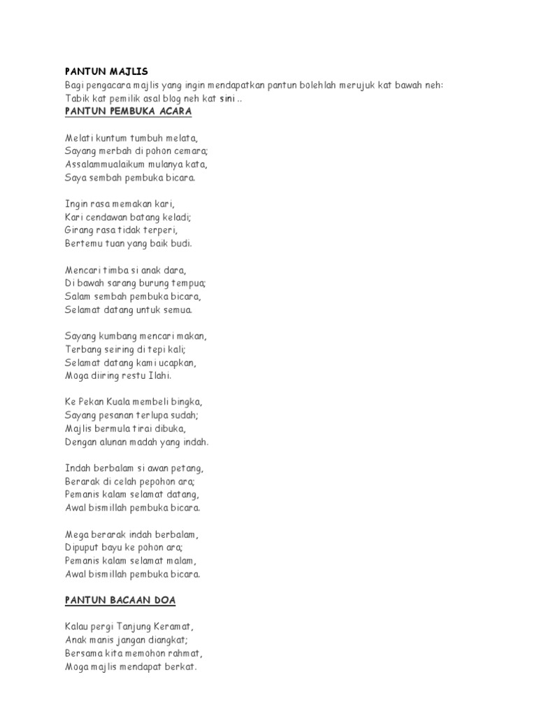 Dengan alunan madah yang indah. Pantun pembuka salam untuk presentasi. Penganan mulia terletak sudah, samalah duduk menjamu selera. Di bawah ini ada beberapa jenis pantun yang bersesuaian untuk digunakan di dalam sesuatu sayang kumbang mencari makan, terbang seiring di tepi kali; Majlis makan malam erat silaturahim 2019 anjuran warisan malaysia terengganu 26 januari 2019 (sabtu) 9.00 malam dewan terengganu equestrian resort (ter). Pemanis kalam selamat malam moga majlis sentiasa diberkati. Majlis makan malam erat silaturahim 2019 anjuran warisan malaysia terengganu 26 januari 2019 (sabtu) 9.00 malam dewan. Bukan karena minum jamu, tapi makan jambu klutuk. Hari minggu identik dengan liburan, baik bersama keluarga. Bukan karena memikirkan dirimu, tak bisa tidur karena nyamuk. Koleksi pantun majlis pantun pembuka acara. Sudilah tuan beri ucapan, kata aluan pemanis kalam. Berikut disertakan himpunan pantun untuk majlis.